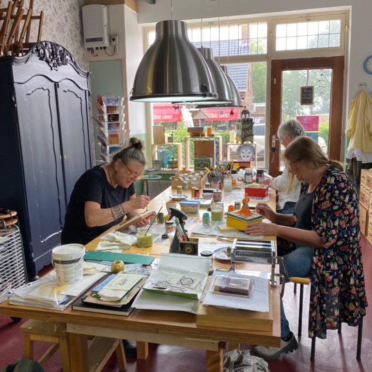 Huiskameratelier voor cursussen en workshops op het gebied van tekenen, schilderen en druktechnieken in kleine groepjes.